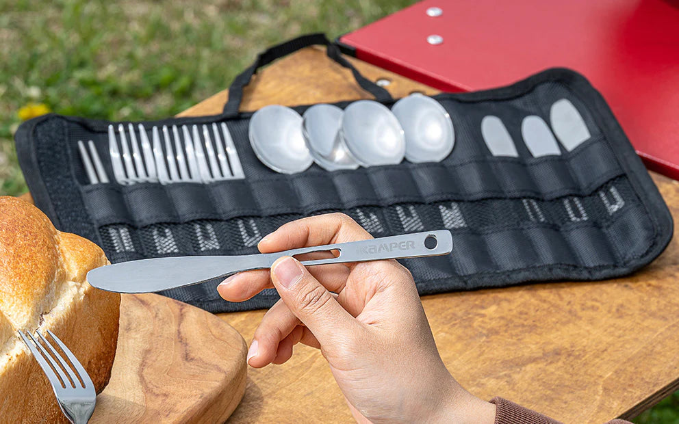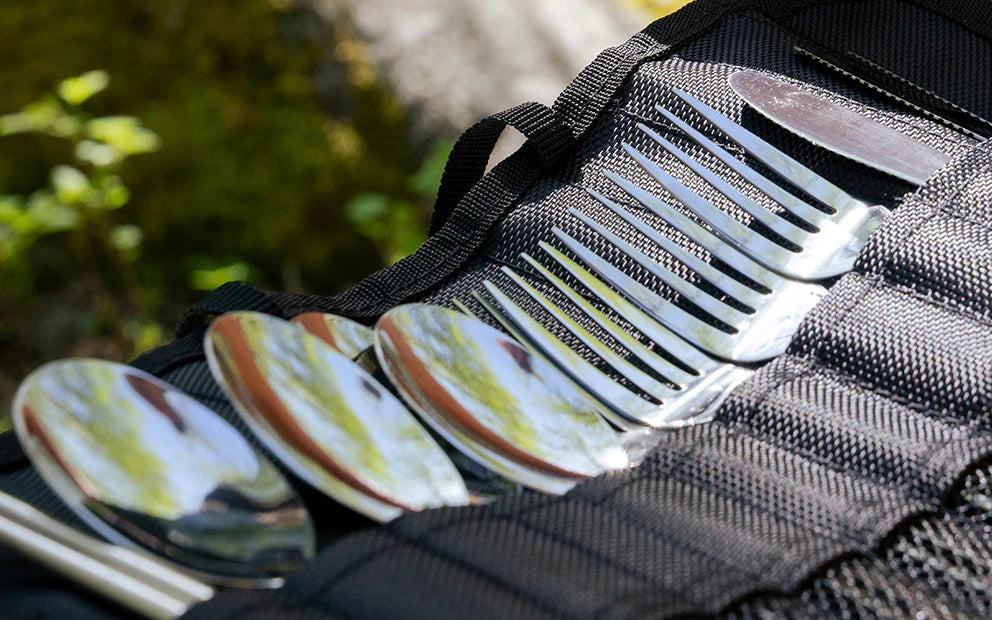 A strapabíró poliészter tok ellenáll a kopásnak és a sérüléseknek, így az evőeszközeid biztonságban és védve maradnak az időjárás viszontagságaitól.